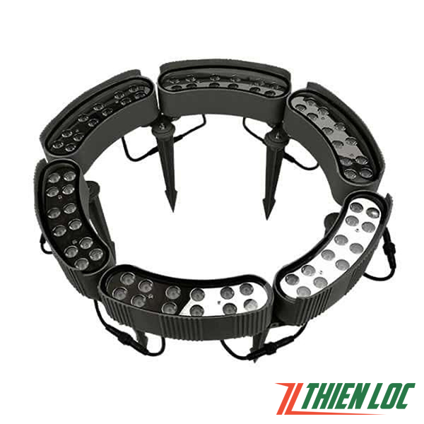Đèn led chiếu cây bán nguyệt 12w: mẫu đèn thiết kế hình bán nguyệt. Thân đèn được tích hợp sẵn giắc nối để ghép các đèn với nhau thành một vòng tròn ôm sát thân cây. Đèn được dùng chiếu sáng gốc cây và hắt sáng cho các tán lá trên cao của cây dừa cảnh, cây cau cảnh.